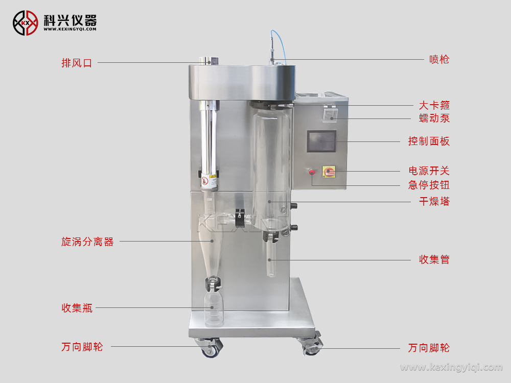 整機全不銹鋼制作;二流體噴霧的霧化結(jié)構,噴霧、烘干及收集系統(tǒng)采用透明的優(yōu)質(zhì)高硼硅耐熱玻璃材料制造